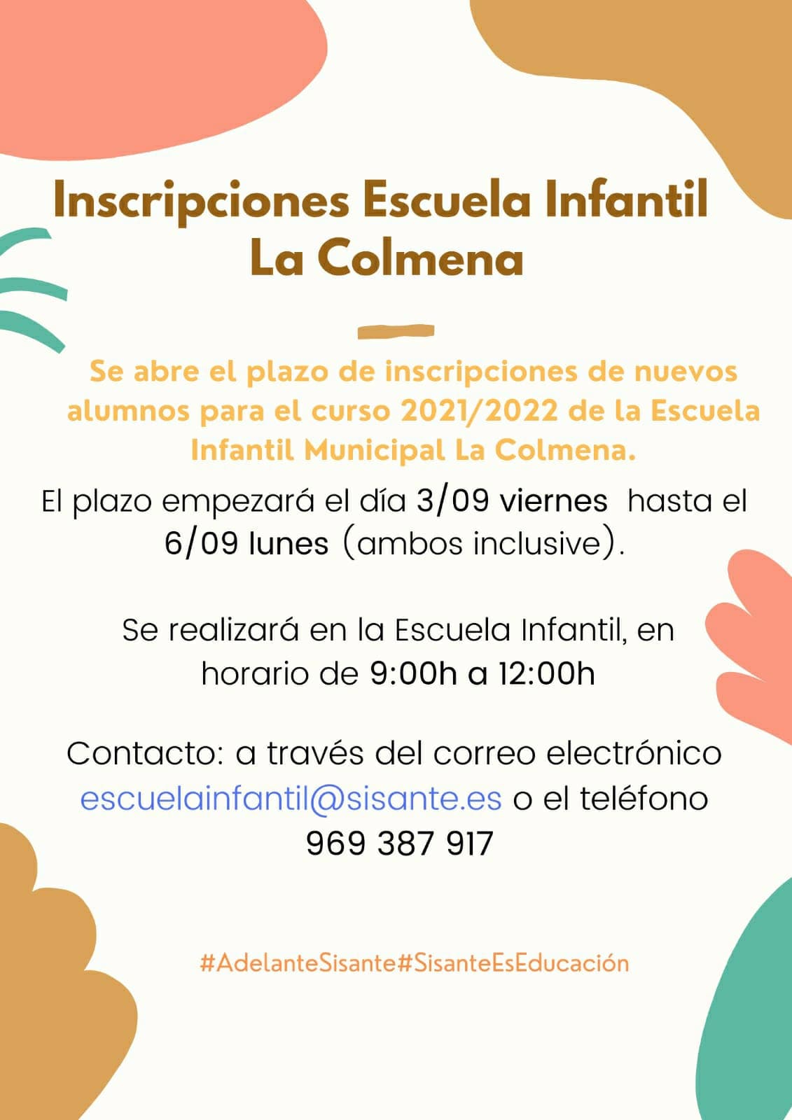 ? Desde la Concejalía de Educación del Ayuntamiento de Sisante, se informa de la apertura del plazo de inscripción de nuevos alumnos para el curso 2021/2022. ? Desde el viernes, 03/08 hasta el lunes 06/08 …