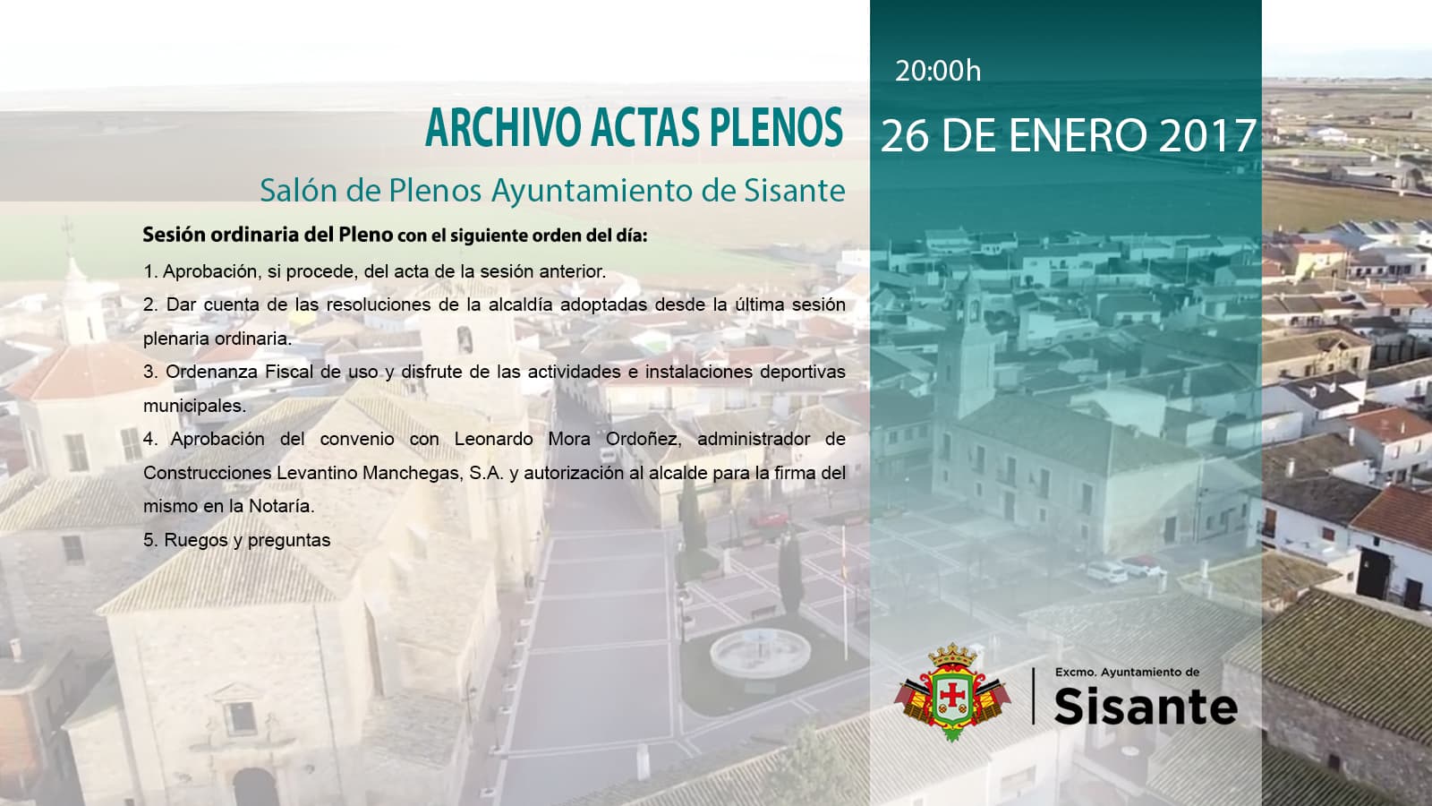 - Aprobación del convenio con Leonardo Mora Ordoñez, administrador de Construcciones Levantino Manchegas, S.A. y autorización al alcalde para la firma del mismo en la Notaría.