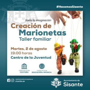 El próximo martes, 2 de agosto, el Centro de la Juventud acogerá un taller familiar de creación de marionetas, bajo el título “Vuelva tu imaginación”, donde pequeños y mayores podrán poner a prueba su creatividad. Esta actividad ha sido organizada por la Concejalía de Cultura y la Concejalía de Educación e Infancia.
