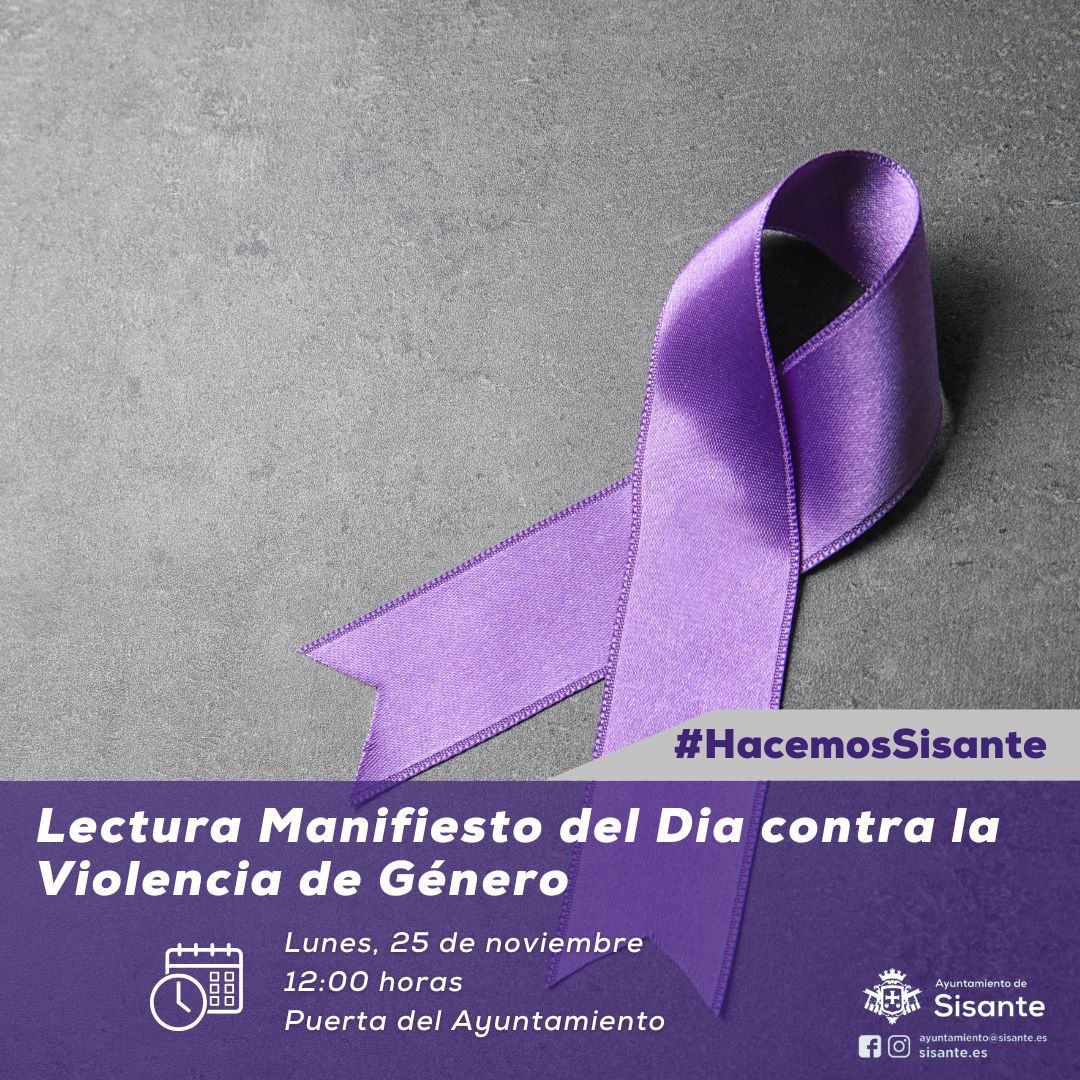 𝐋𝐄𝐂𝐓𝐔𝐑𝐀 𝐌𝐀𝐍𝐈𝐅𝐈𝐄𝐒𝐓𝐎 𝟐𝟓𝐍 Desde el Ayuntamiento de Sisante informamos que con motivo del Día Internacional Contra la Violencia de Género se va a llevar a cabo la tradicional lectura del manifiesto. Lunes 25 de noviembre …