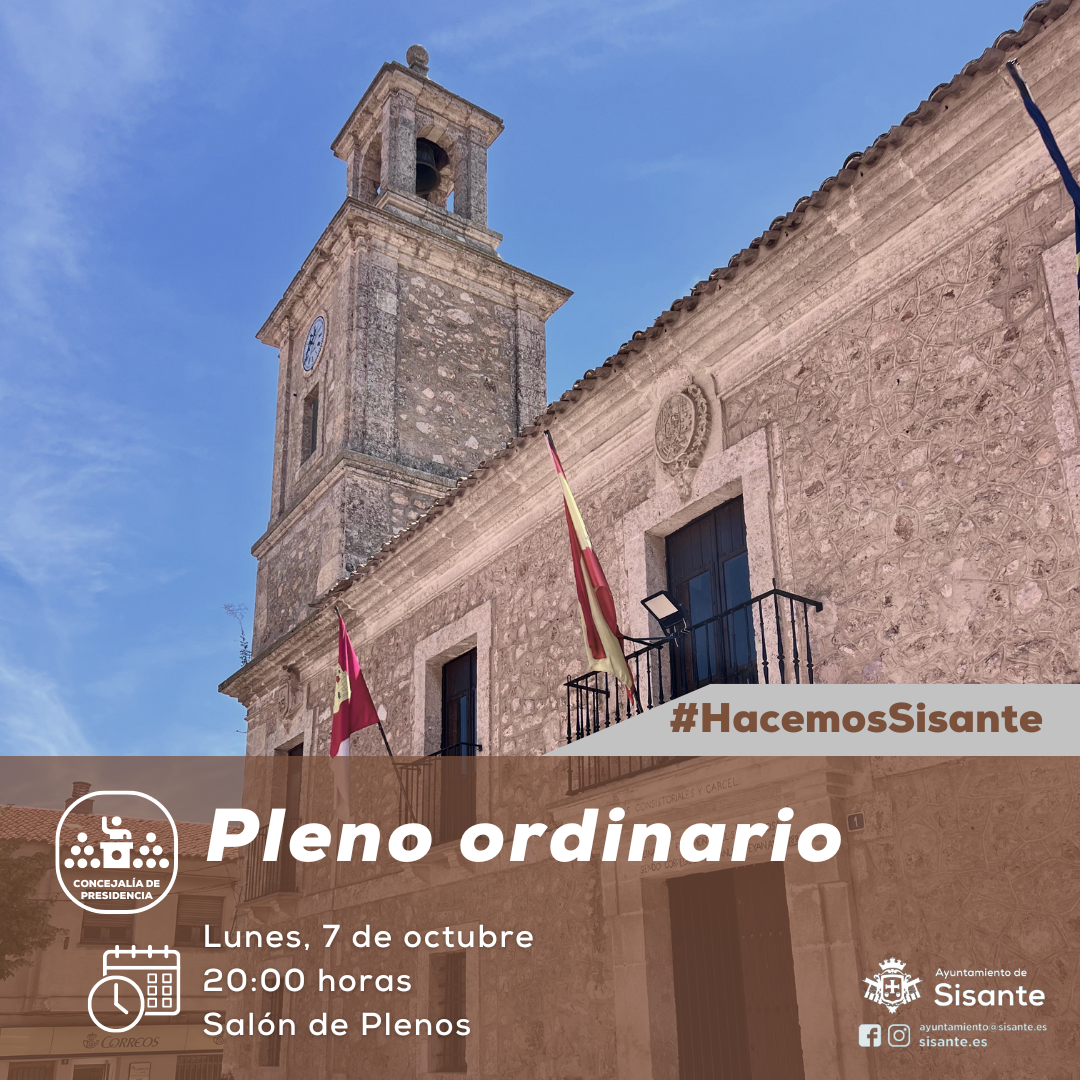 𝐏𝐋𝐄𝐍𝐎 𝐎𝐑𝐃𝐈𝐍𝐀𝐑𝐈𝐎 𝐃𝐄 𝐎𝐂𝐓𝐔𝐁𝐑𝐄 Desde la Concejalía de Presidenia del Ayuntamiento de Sisante se informa de la celebración del Pleno ordinario de octubre. Lunes, 7 de octubre a las 20:00 horas en el Salón de Plenos del …