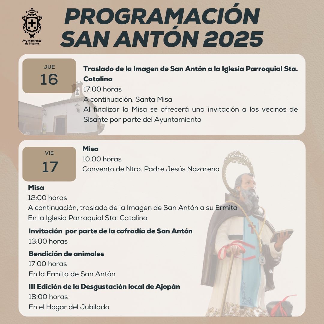 𝐏𝐑𝐎𝐆𝐑𝐀𝐌𝐀𝐂𝐈𝐎́𝐍 𝐒𝐀𝐍 𝐀𝐍𝐓𝐎́𝐍 𝟐𝟎𝟐𝟓 Desde la Concejalía de Tradiciones del Ayuntamiento de Sisante te compartimos la programación completa de los actos organizados para celebrar la festividad de San Antón, patrón de los animales. Jueves 16 …