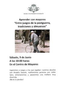 Jugaremos a juegos a los que jugaban nuestros abuelos con Arcadio Gascón, realizaremos pulseras con Julián Sanz, almorzaremos y pasaremos una mañana muy divertida.