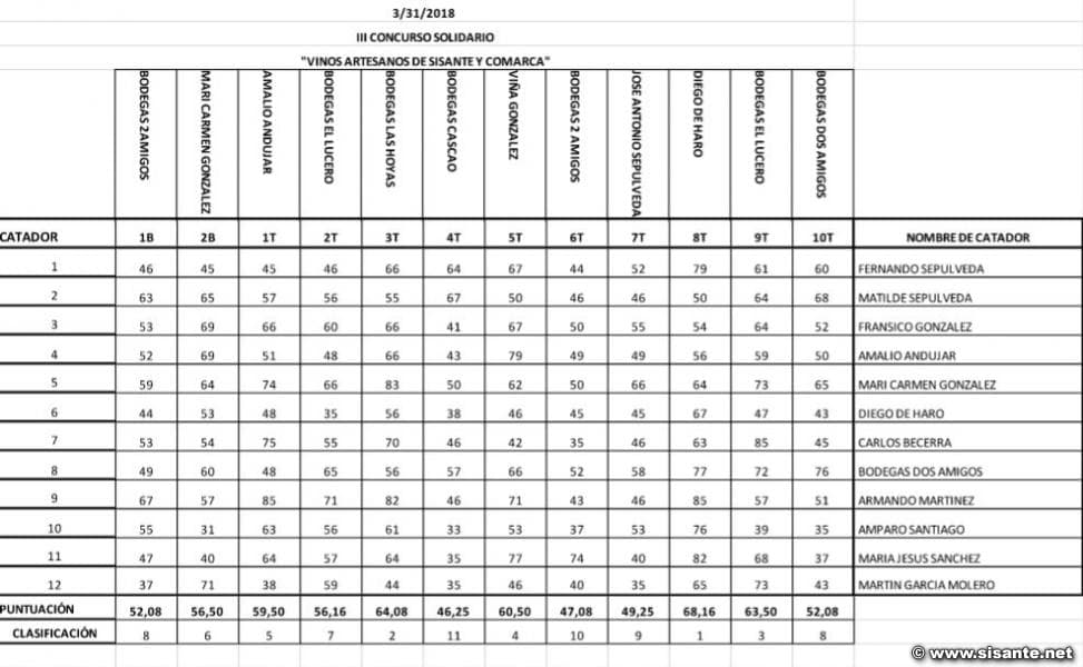 La cata se realizó siendo el jurado los propios bodegueros y representantes de Asociaciones de Sisante nombrados para la ocasión , alta responsabilidad la que tuvieron y difícil elección hasta llegar al vino mayor valorado en la cata: Bodega «Diego Haro» y el mayor valorado local: Bodega “La Hoya”.