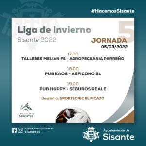 Como viene siendo habitual en fines de semana alternos, el próximo sábado, 5 de marzo, se celebrará en el Polideportivo Municipal la quinta Jornada de Liga de Fútbol de Sisante, que en esta ocasión enfrentará a Talleres Meliasn SF – Agropecuaria Parreño (17:00 horas), Pub Kaos – Asficoho SL (18:00 horas), y Pub Hoppy – Seguros Reale (19:00 horas).