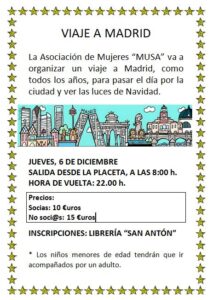 La Asociación de Mujeres “MUSA” va a organizar un viaje a Madrid, como todos los años, para pasar el día por la ciudad y ver las luces de Navidad.
