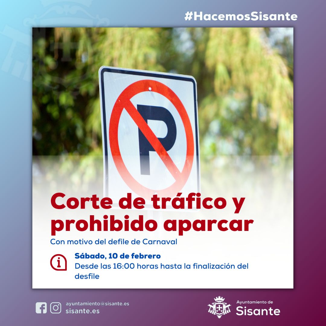 Desde el Ayuntamiento de Sisante informamos a los vecinos que con motivo del desfile de Carnaval, algunas calles permanecerán cortadas al tráfico y además, quedará prohibido aparcar en ellas.