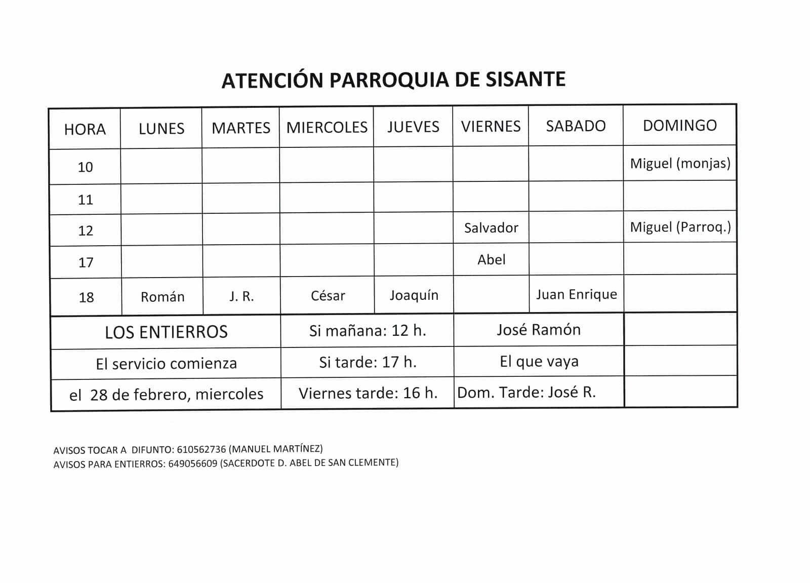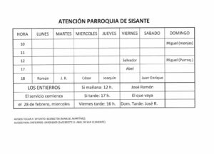 Os informamos de los próximos horarios de los servicios religiosos para los próximos días en Sisante.