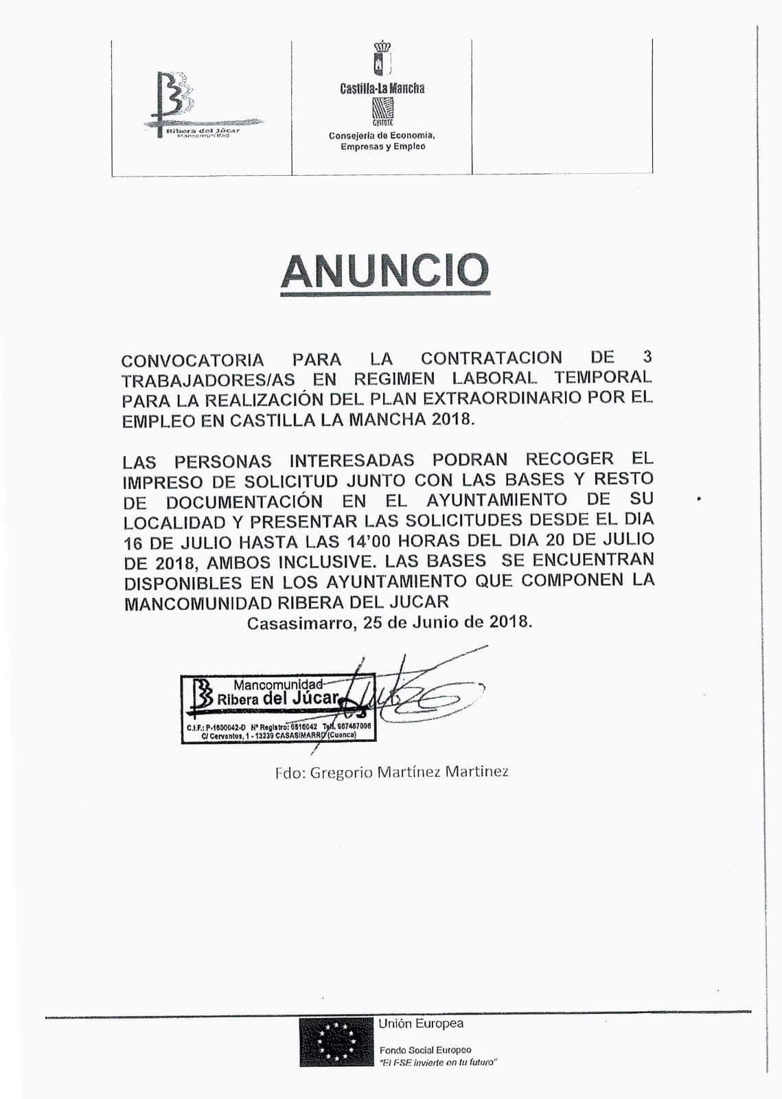 CONVOCATORIA PARA LA CONTRATACIÓN DE 3 TRABAJADORES/AS EN RÉGIMEN LABORAL TEMPORAL PARA LA REALIZACIÓN DEL PLAN EXTRAORDINARIO POR EL EMPLEO EN CASTILLA – LA MANCHA 2018.