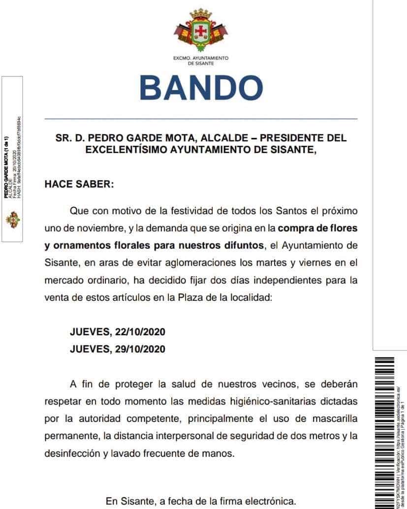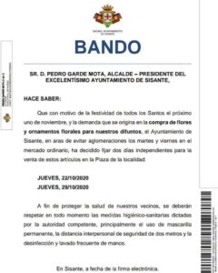 Que con motivo de la festividad de Todos los Santos el próximo uno de Noviembre, y la demanda que se origina en la compra de flores y ornamentos florales para nuestros difuntos, el Ayuntamiento de Sisante, en aras de evitar aglomeraciones los martes y viernes en el mercado ordinario, ha decidido fijar dos días independientes para la venta de estos artículos en la Plaza de la localidad: