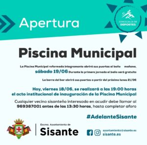 ✅ Hoy, viernes 18/06, se realizará a las 19:00 horas el acto institucional de inauguración de la Piscina Municipal.