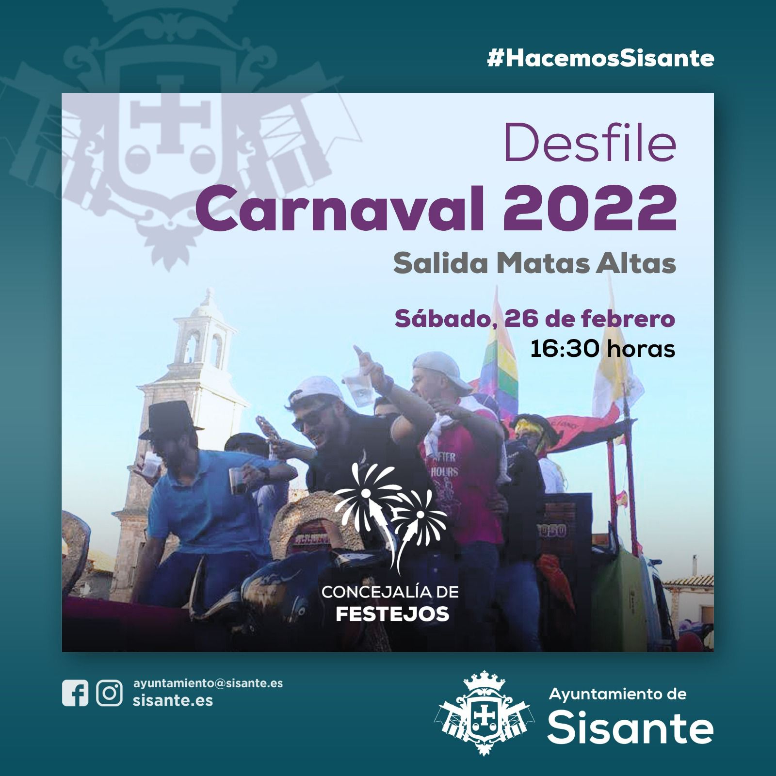 La concentración de los participantes disfrazados será el día sábado 26 de febrero, a partir de las 16:30 horas, en la convergencia de las calles Matas Altas y Castilla-La Mancha (jardín donde se ubica la escultura homenaje a la mujer sisanteña). Se efectuará la salida del desfile a las 17:00 horas desde la calle Mayor, con el siguiente recorrido: