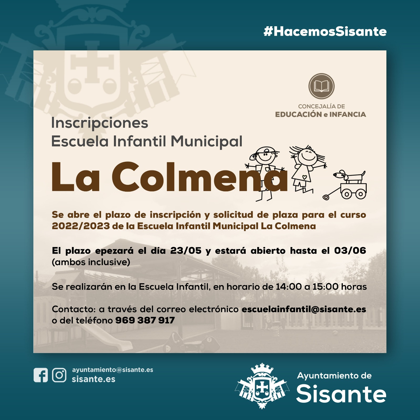 El lunes 23 de mayo se abre el plazo de inscripción y solicitud de plaza para la Escuela Infantil Municipal ‘La Colmena’ para el curso 2022-23. Se podrán presentar las solicitudes hasta el viernes, 3 de junio.