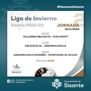 Desde la concejalía de Deportes del Ayuntamiento de Sisante, informamos de que el sábado, 19 de noviembre de 2022, se va a llevar a cabo la realización de la segunda jornada de la Liga de Invierno de Fútbol Sala.
