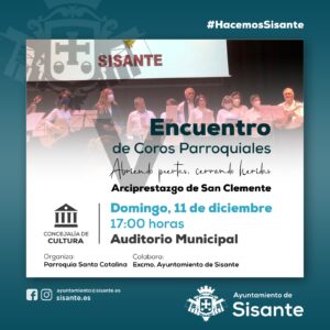 Desde la Concejalía de Cultura del Ayuntamiento de Sisante informamos, que el próximo domingo, 11 de diciembre de 2022, a las 17:00 horas, se va a realizar el tradicional Encuentro de Coros Parroquiales del Arciprestazgo de San Clemente, que en esta quinta edición, se va a celebrar, bajo el lema: “Abriendo puertas, cerrando heridas”.