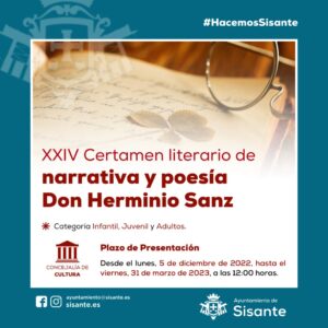 Desde la Concejalía de Cultura del Ayuntamiento de Sisante informamos de la realización del evento cultural, por excelencia, de nuestro pueblo; como es, el XXIV Certamen literario de narrativa y poesía Don Herminio Sanz.