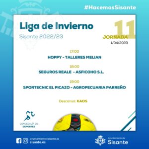 Desde la Concejalía de Deportes del Ayuntamiento de Sisante informamos de que el próximo sábado, 1 de abril de 2023, desde las 17:00 horas, en el Polideportivo Municipal; va a llevarse a cabo la undécima jornada de la Liga de Invierno de Fútbol Sala.