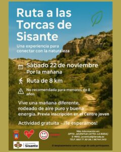 Desde la Concejalía de Deportes informamos que desde el Centro Joven de la Roda, en colaboración con el Ayuntamiento de Sisante, se ha organizado una ruta de senderismo a Las Torcas. Una experiencia para conectar con la naturaleza y disfrutar del aire libre por nuestro paraje natural más singular.