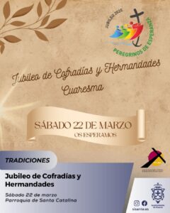 𝐉𝐔𝐁𝐈𝐋𝐄𝐎 𝐃𝐄 𝐂𝐎𝐅𝐑𝐀𝐃𝐈́𝐀𝐒 𝐘 𝐇𝐄𝐑𝐌𝐀𝐍𝐃𝐀𝐃𝐄𝐒 – 𝐂𝐔𝐀𝐑𝐄𝐒𝐌𝐀 𝟐𝟎𝟐𝟓 Desde la Junta de Cofradías y Hermandades de Sisante informan sobre la celebración del Jubileo de Cofradías y Hermandades enmarcado en el Año Jubilar 2025. Sábado 22