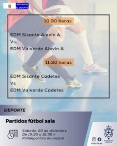 𝐏𝐀𝐑𝐓𝐈𝐃𝐎𝐒 𝐃𝐄 𝐅𝐔́𝐓𝐁𝐎𝐋 𝐒𝐀𝐋𝐀 Desde la Concejalía de Deportes del Ayuntamiento de Sisante informamos de los partidos de fútbol sala programados entre el EDM Sisante y el EDM Valverde. Sábado, 20 de diciembre Polideportivo Municipal