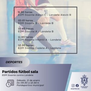 𝐏𝐀𝐑𝐓𝐈𝐃𝐎𝐒 𝐅𝐔́𝐓𝐁𝐎𝐋 𝐒𝐀𝐋𝐀 Desde la Concejalía de Deportes del Ayuntamiento de Sisante informamos de la realización de los diversos partidos de fútbol sala programados para este fin de semana donde se enfrentaran los equipos del
