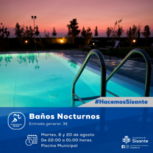 𝐁𝐀𝐍̃𝐎𝐒 𝐍𝐎𝐂𝐓𝐔𝐑𝐍𝐎𝐒 Desde la Concejalía de Deporte del Ayuntamiento de Sisante se han habilitado dos días de baños nocturnos. Para acceder a los baños nocturnos, será imprescindible adquirir una entrada general con un coste de