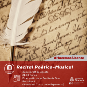 𝐑𝐄𝐂𝐈𝐓𝐀𝐋 𝐏𝐎𝐄́𝐓𝐈𝐂𝐎-𝐌𝐔𝐒𝐈𝐂𝐀𝐋 La Concejalía de Cultura del Ayuntamiento de Sisante ha organizado, como cada año, el recital poético-musical. Tendrá lugar el jueves, 08 de agosto a las 21:00 horas en el patio de la Ermita de San