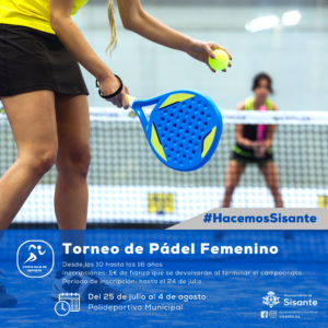 𝐓𝐎𝐑𝐍𝐄𝐎 𝐏𝐀́𝐃𝐄𝐋 𝐅𝐄𝐌𝐄𝐍𝐈𝐍𝐎 Desde la Concejalía de Deportes del Ayuntamiento de Sisante se informa de la realización del Torneo de Pádel Femenino. Del jueves, 25 de julio al domingo, 4 de agosto. Podrán participar niñas