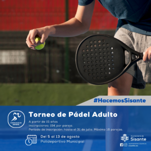 𝐓𝐎𝐑𝐍𝐄𝐎 𝐏𝐀́𝐃𝐄𝐋 𝐀𝐃𝐔𝐋𝐓𝐎𝐒 Desde la Concejalía de Deportes del Ayuntamiento de Sisante se ha organizado el ya tradicional Torneo de Pádel Adultos. Del lunes, 5 de agosto al martes, 13 de agosto. Para la participación