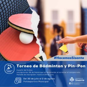 𝐓𝐎𝐑𝐍𝐄𝐎 𝐁𝐀́𝐃𝐌𝐈𝐍𝐓𝐎𝐍 𝐘 𝐏𝐈𝐍-𝐏𝐎𝐍 Desde la Concejalía de Deportes del Ayuntamiento de Sisante se informa de la realización del Torneo de Bádminton y Pin-Pon. Del martes, 30 de julio al viernes, 2 de agosto. Podrán