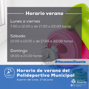 𝐂𝐀𝐌𝐁𝐈𝐎 𝐃𝐄 𝐇𝐎𝐑𝐀𝐑𝐈𝐎 𝐃𝐄 𝐋𝐀𝐒 𝐈𝐍𝐒𝐓𝐀𝐋𝐀𝐂𝐈𝐎𝐍𝐄𝐒 𝐃𝐄𝐏𝐎𝐑𝐓𝐈𝐕𝐀𝐒 Desde la Concejalía de Deportes del Ayuntamiento de Sisante informamos que a partir del lunes, 17 de junio las instalaciones deportivas municipales adoptaran el horario de verano. De