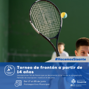 TORNEO DE FRONTÓN JUNIOR Desde la Concejalía de deportes del Ayuntamiento de Sisante se comunica la celebración del torneo de frontón junior próximamente. Del 17 al 25 de junio en el Polideportivo Municipal. Podrán participar