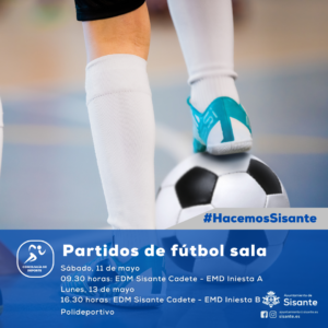 𝐏𝐀𝐑𝐓𝐈𝐃𝐎𝐒 𝐃𝐄 𝐅𝐔́𝐓𝐁𝐎𝐋 𝐒𝐀𝐋𝐀 Desde la Concejalía de Deportes del Ayuntamiento de Sisante se comunica la celebración de los siguientes partidos de fútbol sala. El primer partido se disputará el sábado, 11 de mayo a