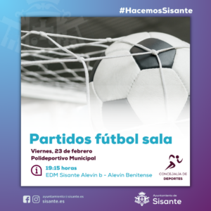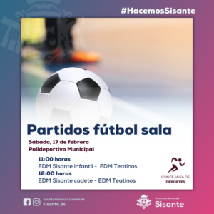 𝐏𝐀𝐑𝐓𝐈𝐃𝐎𝐒 𝐃𝐄 𝐅𝐔́𝐓𝐁𝐎𝐋 𝐒𝐀𝐋𝐀 Desde la Concejalía de Deportes del Ayuntamiento de Sisante se comunica de la celebración del partido de fútbol sala. Este viernes, 23 de febrero en el Polideportivo Municipal a las 19.15 horas se