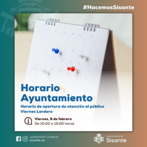 Desde el Ayuntamiento de Sisante se informa del cambio puntual de horario de atención al público del viernes, día 9 de febrero. Con el objetivo de seguir brindando el mejor servicio posible y adaptarnos a