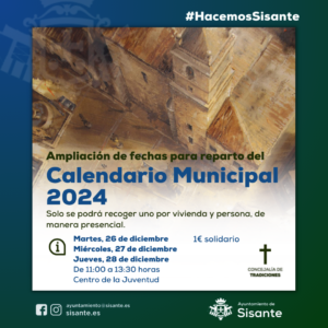 Desde la Concejalía de Tradiciones del Ayuntamiento de Sisante se ha decidido ampliar el plazo para el reparto del Calendario Municipal 2024, para que todo el mundo tenga el tiempo suficiente de hacerse con el