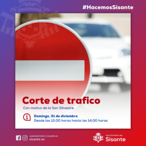 Desde el Ayuntamiento de Sisante informamos a los vecinos que con motivo de la la tradicional San Silvestre Navideña, algunas calles permanecerán cortadas al tráfico. Domingo, 31 de diciembre, desde las 12:00 hasta las 14:00