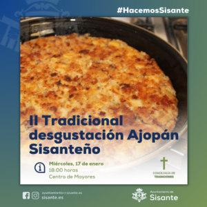 Desde la Concejalía de Tradiciones del Ayuntamiento de Sisante, se vuelve a convocar la degustación del tradicional ajopán sisanteño con motivo del día de San Antón. El próximo miércoles, 17 de enero a las 18:00 horas