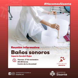 Desde la concejalía de Deportes del Ayuntamiento de Sisante anunciamos la próxima reunión informativa sobre el taller de Baños Sonoros. La reunión tendrá lugar el próximo viernes, 17 de noviembre a las 20:30 horas en el Centro