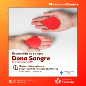 Desde el Ayuntamiento de Sisante se informa de la donación de sangre que se va a realizar en el municipio, por la Hermandad de Donantes de Sangre de Cuenca. Las extracciones se realizarán el martes,