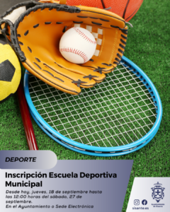 ⛹️♂️ Inscripción Escuela Deportiva Municipal 2025/2026 La Concejalía de Deportes de Sisante abre el plazo de inscripción para la Escuela Deportiva Municipal del curso 2025/2026. Plazo de inscripción:Desde hoy, jueves 18 de septiembre, hasta las