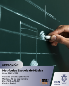 Matrículas Escuela de Música Sisante – Curso 2025/2026 La Banda Municipal de Música de Sisante anuncia la apertura del plazo de inscripción para el curso 2025/2026 de la Escuela de Música. Fechas de matrícula: Viernes