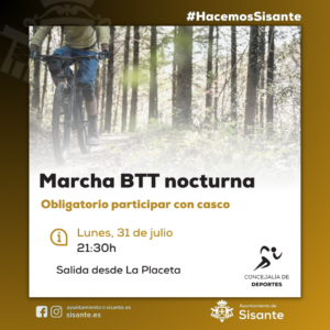 La Concejalía de Deportes del Ayuntamiento de Sisante ha organizado una marcha BTT nocturna. Tendrá lugar el lunes, 31 de julio, a las 21:30 horas. Salida desde La Placeta. Para la participación en la marcha es