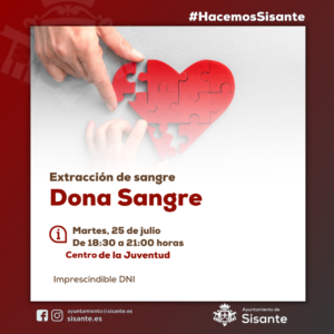 Desde el Ayuntamiento de Sisante se informa de la donación de sangre que se va a realizar en el municipio. Las extracciones tendrán lugar el martes, 25 de julio, de 18:30 a 21:00 horas en