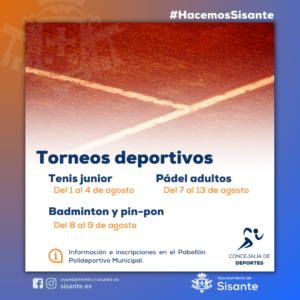 La Concejalía de Deportes del Ayuntamiento de Sisante ha organizado una serie de torneos deportivos para el mes de agosto. Torneo de tenis junior. Del 1 al 4 de agosto. Torneo de pádel adultos. Del