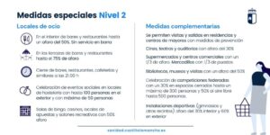 Desde ayer la JCCM ha flexibilizado las restricciones impuestas, fijando medidas especiales de nivel 2. Las más relevantes son: En bares y restaurantes: Aforo del 50% interior y 75% exterior. Cierre a las 21:00